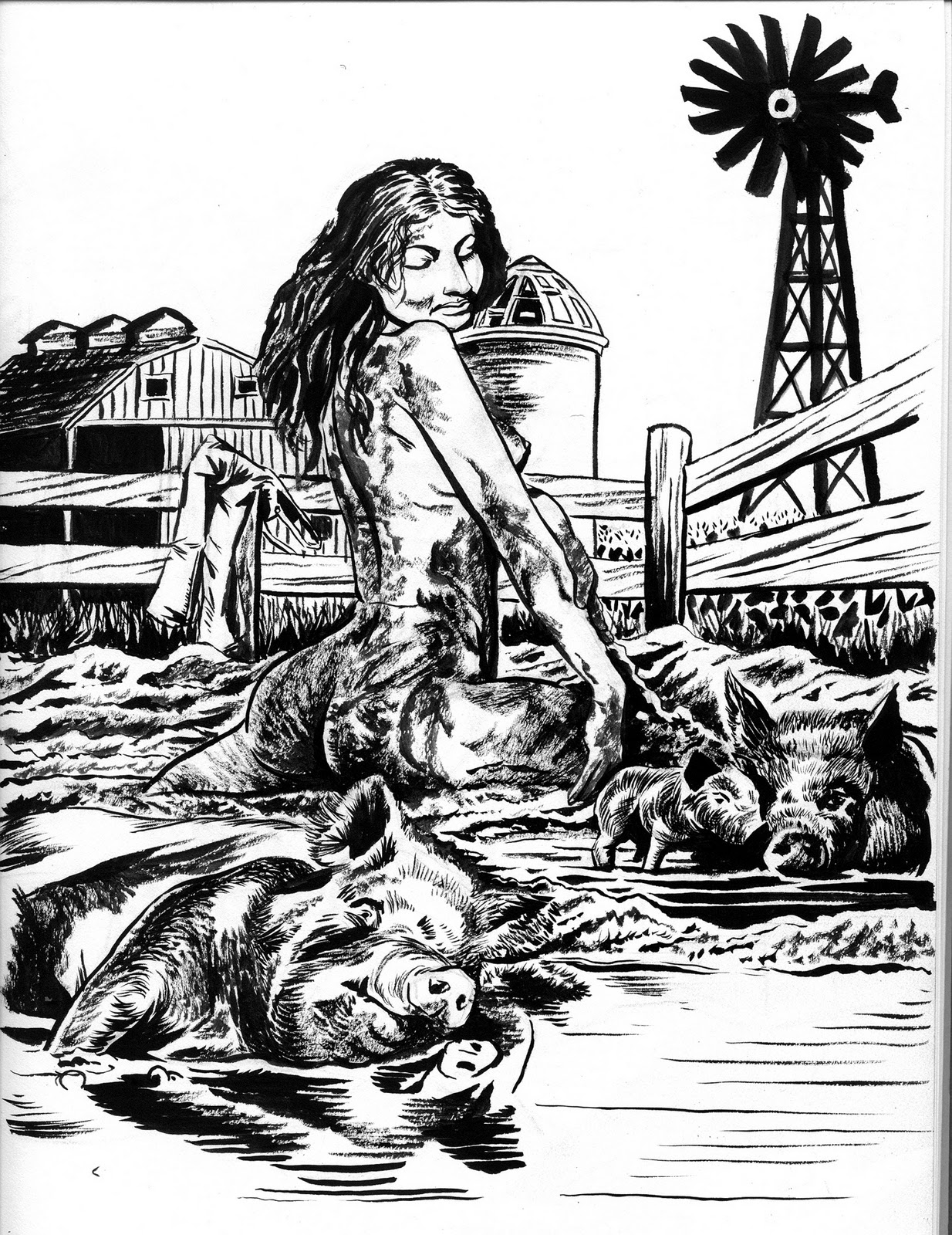 Anyway, here's a pose I dug up from my figure drawing class and placed the model in the part of a girl down on the farm looking to beat the heat by taking a mud bath with the piggies. I blame the inspiration for this particular setting on having seen "The Wizard of Oz" over the weekend, and having a bit of a laugh at the scene at the beginning were Dorothy, who apparently doesn't do any work, falls into the cleanest pig pen in the universe!